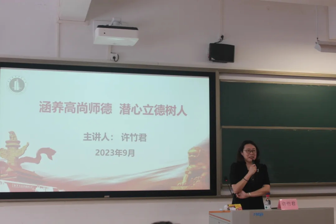 项目负责人陈少宇介绍了培训班的安排,专家团队和教学设计等,并对参训学员明确了学习任务和纪律要求等。随后,教师工作部部长、人事处处长许竹君讲授了《涵养高尚师德、潜心立德树人》主题讲座。