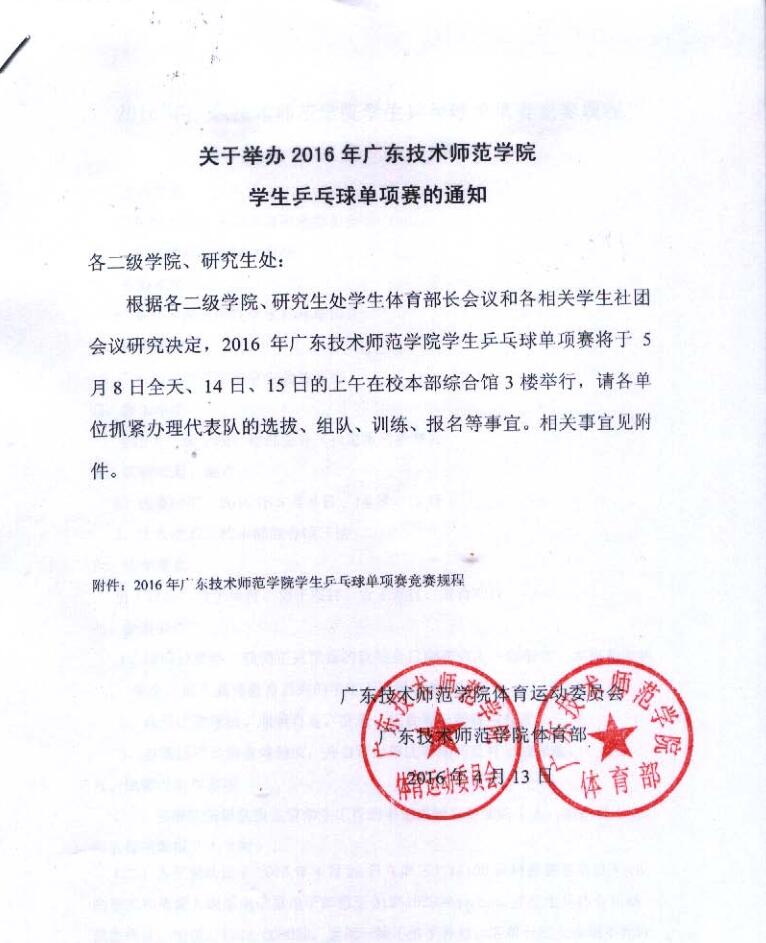 关于2016年广东技术师范公司员工乒乓球单项赛的通知