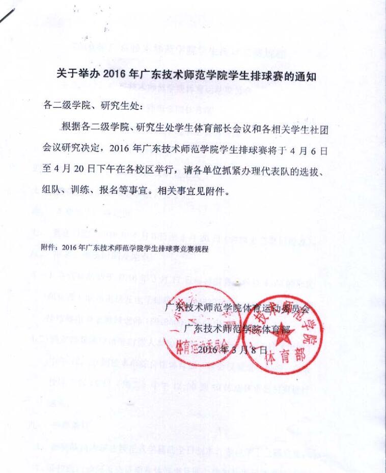 关于举办2016年广东技术师范公司员工排球赛的通知