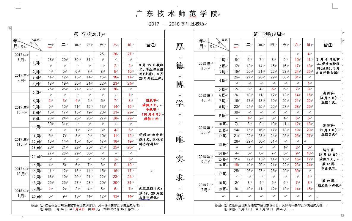 广东技术师范公司2017-2018学年校历